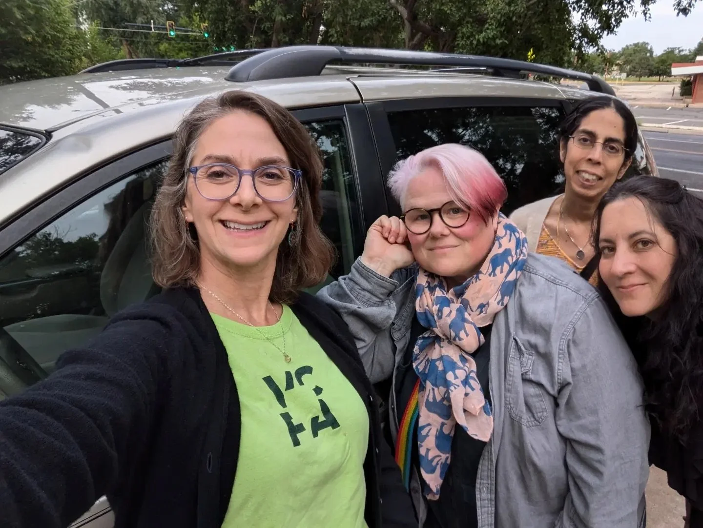 Selfie of Laura Shovan wearing a green VCFA tshirt, standing with three of her faculty friends.